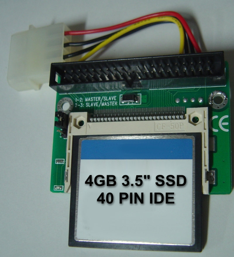 This 4GB IDE 40 PIN 3.5 Inch SSD CF Card & Adapter plugs onto the Flat IDE Cable in Place of the 3.5 Inch IDE Hard Drive to replace 4GB and smaller vintage 3.5 Inch IDE Hard Drives. Small Square of Velcro included to secure in place since MOUNTING HOLES DO NOT MATCH DRIVE. Tested good before shipping. Drives are Completely Blank and will need partition and format or operating system installed to be a working drive to the computer.